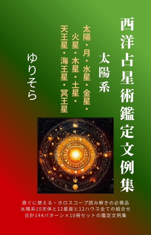 こちらの商品は太陽~冥王星までの10個の天体と12星座と12ハウス⇒天体×12星座×12ハウス=144個の鑑定文を、それぞれ250文字前後でまとめたPDFファイル、10冊セットの大変お得なおまとめ商品です。