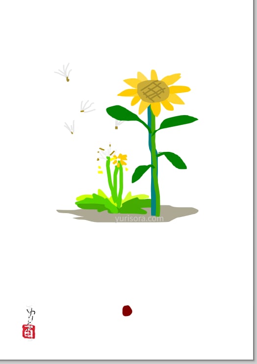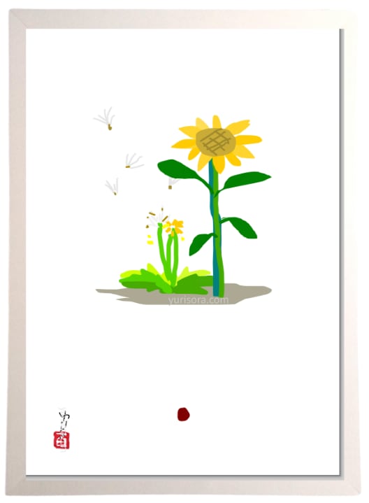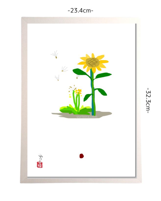 アートポスター A4サイズ 癒しの空間 太陽の絵文書「タンポポとひまわり」フレーム付き 送料無料
